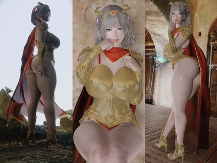 Daymarr's Guardian Goddess, featuring a unique light armor set for a warrior/paladin style playthrough. this ensemble includes support for CBBE 3BA & COCOBody CBBE/UUNP bodyslides. Additionally, the cape and skirt feature HDT-SMP cloth physics for added realism.